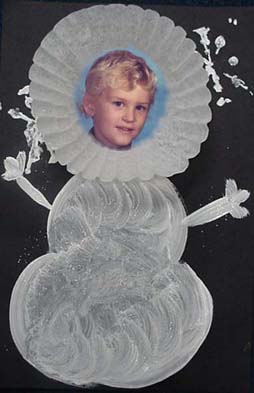 Had to share these adorable "snow people" the children made in our winter camp program today. I took digital photos of the children's faces and after printing them out I cut the photos into a circle which fit in the middle of a coffee filter. I glued each child's coffee filter picture on a black 11x14 piece of construction paper. The children then used white paint to paint on the rest of the "snowman's" body. I used the bottom of strawberry baskets to make snowflake stampers and the children painted these white and printed snowflakes on the page. Then they sprinkled with some silver glitter and voila...a Snow - Emma; Bobby; Eliza etc. I did this activity with 3's and it was very in sync with their abilities. I have to tell you that these got lots of "oo's" and "ah's" from the Moms when they picked up today and the children had lots of fun making them.