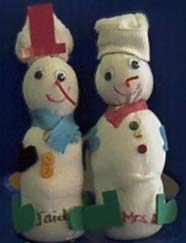 To make this snowman, we stuffed a clean white sock with cotton batting. Add some sand in the bottom of the sock to help it stand upright before stuffing. We placed rubber bands to section off the head from the rest of the body about 1/3 down. Then another one about 2" from the top near where the ankle part begins. Then we fold over that top part to make the hat. We glue on googly eyes on the head portion, use foam/felt/laminated paper for a hat on that top folded over part, and foam pieces for the boots in the bottom section. Add felt pieces for mittens, glue buttons in middle section, and a pipe cleaner or foam piece for the nose. We draw in the mouth. You could make it in 3 sections too but the rubber band doesn't always stay. You could vary the decorations to match with what you have in classroom. The kids love it. They write stories about their snowman as well.
