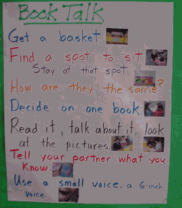 Our Partner Book Talk is an extension of our Read Aloud with accountable talk. After the Read Aloud, sets of two children pick a basket of books from around the room. Book baskets are sorted by genre, author, current theme, reading level, topic etc. The chart we created using digital pictures of the students says: