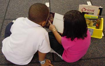 Many of these books are above their reading level so they are looking at pictures, discussing story lines, doing a picture walk, finding familiar sight words etc. Many are non-fiction books so they are discussing what they already know about the pictures. The focus is on talking about books not so much reading to your partner. This activity is a precursor to Literature Circles.
