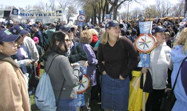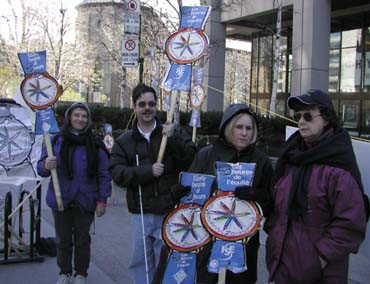 So, on Thursday, May 2, 2002 Quebec teachers began a two and a half day vigil in front of the Offices of the Minister of the Treasury in downtown Montreal. (A similar vigil was held simultaneously in Quebec City.) It was a peaceful, non-violent way for the teachers to make their point. Buses brought many teachers to the vigil from nearby places such as Joliette, Sherbrooke, Lac St. Jean and the South Shore. The CSQ (French Teachers' Union) along with QPAT (English Teachers' Union) joined together in solidarity to send one message to the Quebec Government: that it is a reasonable expectation that they be recognized and paid as full time professionals.