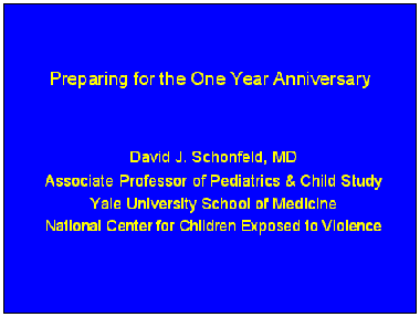 David J. Schonfeld, MD, is a developmental-behavioral pediatrician and Associate Professor of Pediatrics and Child Study, Yale University School of Medicine. He coordinates the School Crisis Response Initiative of the National Center for Children Exposed to Violence at the Yale Child Study Center.