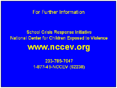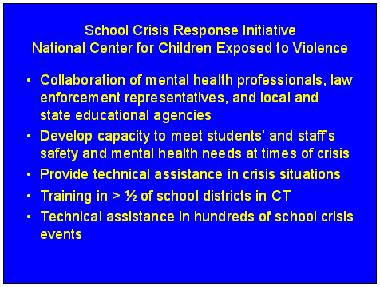 The School Crisis Response Initiative, which Dr. Schonfeld began in 1991, is a collaboration of the Yale Child Study Center and community mental health professionals, law enforcement representatives, and local and state educational agencies. The program empowers school staff through planning and training in school crisis response, provides consultation to schools in developing their capacities to meet students' and staff's emotional and mental health needs at times of crisis, and provides technical assistance in resolving problems arising in specific crisis situations.