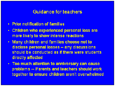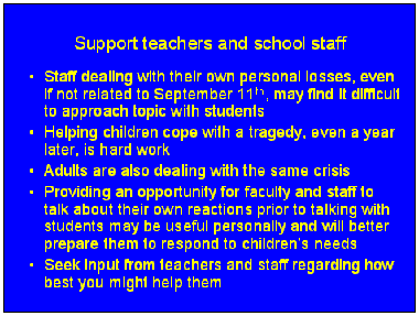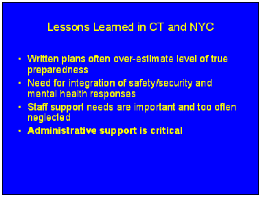 Over the past ten years, the Program has provided training in over half of the school districts in Connecticut and throughout the country, involving tens of thousands of school-related professionals. Dr. Schonfeld has also provided presentations on pediatric bereavement and school crisis response in England, Israel, Japan and Sweden, and has provided technical assistance during hundreds of school crisis events. After the events of September 11th, Dr. Schonfeld and his colleagues began consulting to New York City Public Schools on coordinating school crisis response training for a system of 1200 schools serving over 1.1 million students.