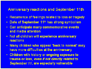 He has also written commentaries and articles on children and terrorism which appeared within the past year in several professional publications, including Pediatrics, Journal of Adolescent Health, and Journal of Developmental and Behavioral Pediatrics and has provided numerous workshops to school personnel, lay audiences and professional groups and been interviewed by regional and national print, radio, and television media.